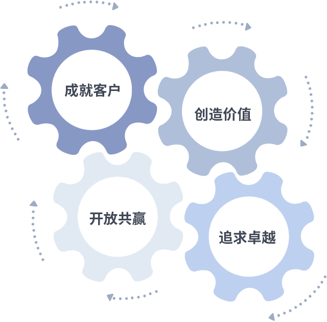 成就客户是一切决策的出发点,,,创造价值是衡量所有工作的标准,,追求卓越是我们做事做人的态度,,,,开放共赢是我们的格局也是最终的结果。。。。价值观的齿轮环环相扣,,推动着组织里的每个人不断向前。。。